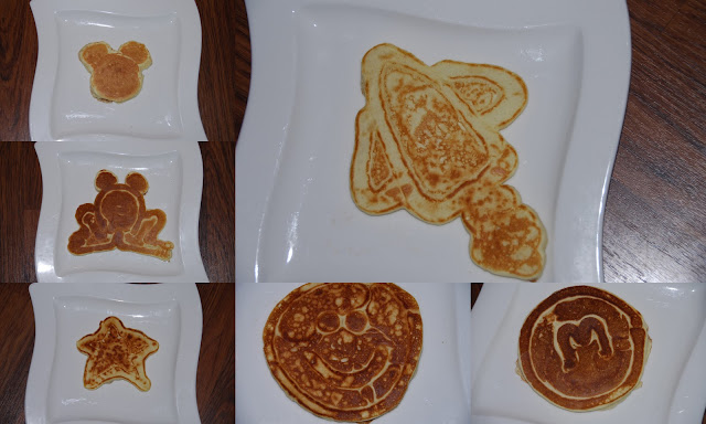 When I was little my mom used to make me Micky Mouse or smiley face pancakes. Breakfast was an ode to her. Generally, I just use a spoon and do the smiley face or Micky Mouse. However, today was special, so I broke out the pastry bag and got fancy. I basically drew the outline first and then filled in the picture. I took requests and ended up with Micky Mouse, a frog, a starfish, a smiley face, an M&M and a rocket ship.